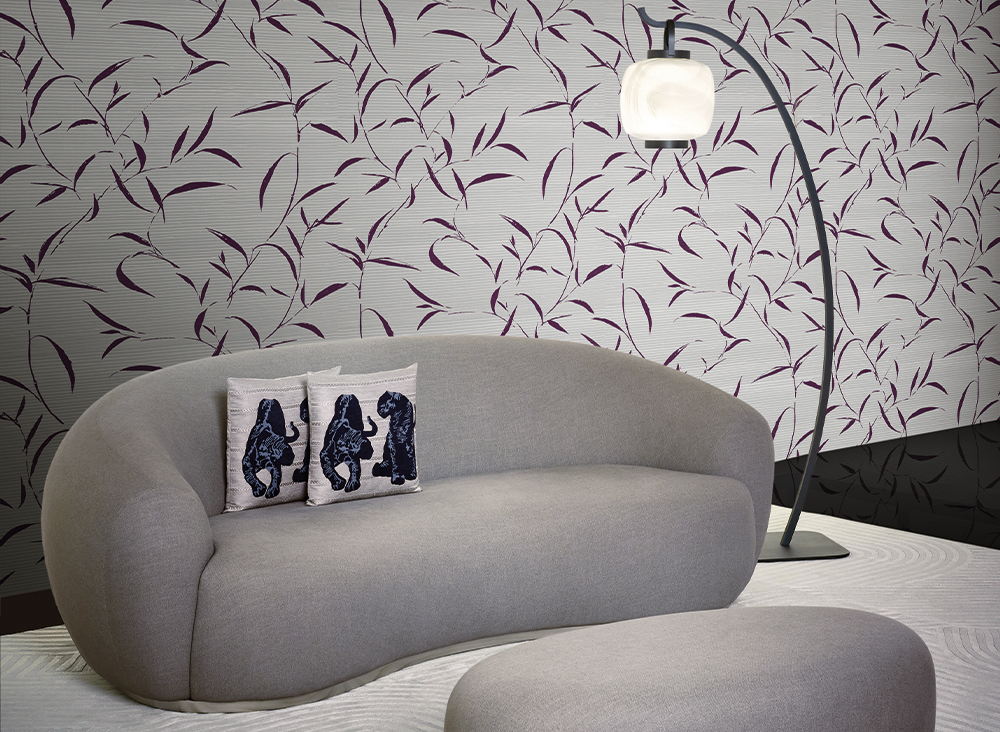 Precious Fibers 4 resta fedele alla filosofia della collezione, mescolando materiali raffinati per enfatizzare la bellezza di design panoramici e in scala macro. Sinuosi rami dalle foglie allungate in lacca lucida prendono vita su seta opaca plissettata, delineando un tratto deciso e materico sul fondo tridimensionale. Il disegno, che ha forti legami sia con la natura sia la moda Armani, si ispira alla celebre Canzone del Salice contenuta nell’Otello (1816) di Giacomo Rossini.